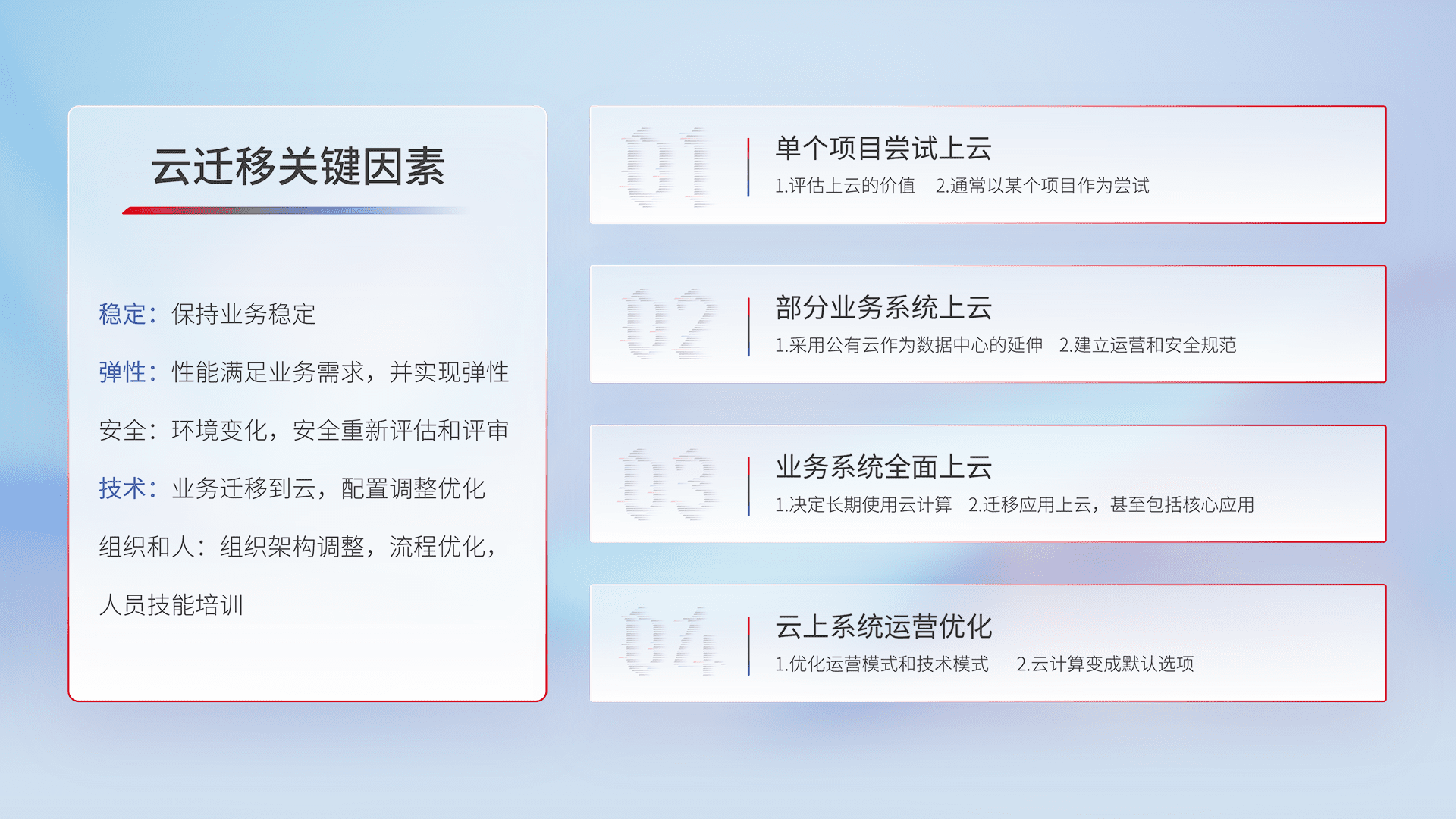结合实际业务,,,,从规划设计、、、云平台选型、、、云原生改造、、数据迁移、、集成交付,,,迁移全过程为客户识别最佳上云路径,,,做好风险识别管理,,,,设计网络架构、、、、身份权限、、、安全审计合规、、操作审计、、日志审计、、监控告警策略、、、多站点容灾设计等,,,,对云上基础设施进行整体规划,,,,提升IT治理水平,,以满足弹性、、、、高可用、、、高性能的需求。。。。