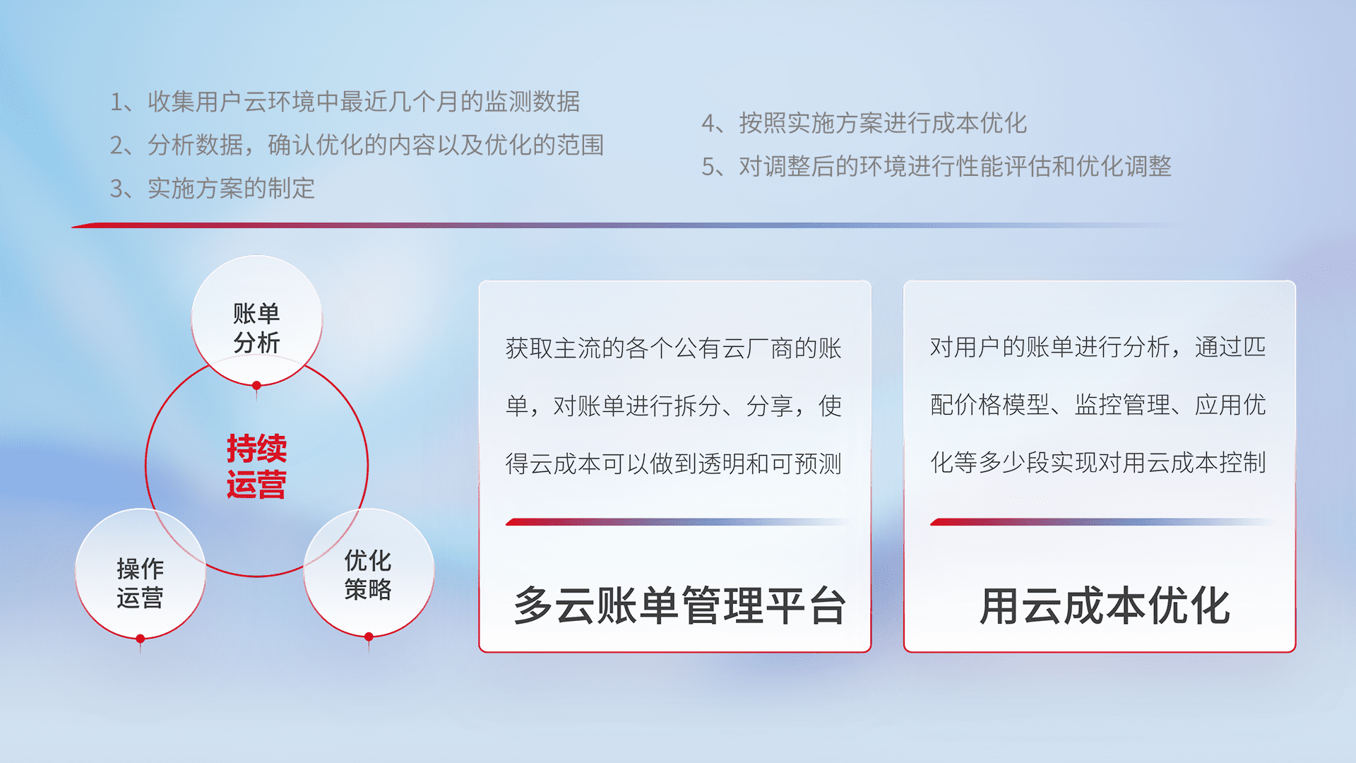 通过多云纳管,,,以统一的资源数据模型把客户的云资源进行抽象和封装,,,,进而实现对多云资源的统一操作,,,,保障云资源管理的可靠性、、、、稳定性与可用性。。。量身定制化运维内容,,配置、、、开发运维、、补丁管理、、、、备份、、、监控、、、、认证和访问管理、、、审计和日常巡检等,,,,保障在用云过程中的可靠度,,,,稳定度以及高可用率。。。。