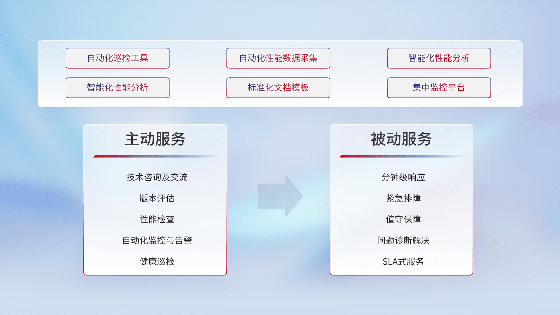智能化工具和标准化文档,,保障服务质量,,提供主动服务(包含技术咨询、、、、版本评估、、、性能检查、、、自动化监控与告警、、健康巡检)和被动服务包含(分钟级响应、、紧急排障、、、值守保障、、、、问题诊断解决、、、SLA服务)。。
