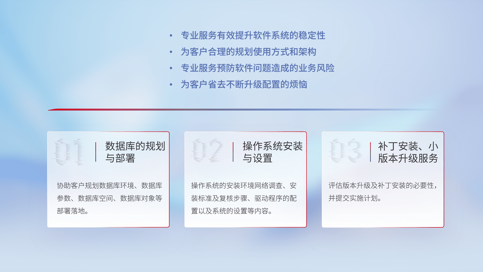 为客户提供软件规模升级、、快速部署、、、、按需配置的专业服务,,从数据库的规划与部署到操作系统的安装与设置,,,,再到补丁安装和小版本升级提供支持。。
