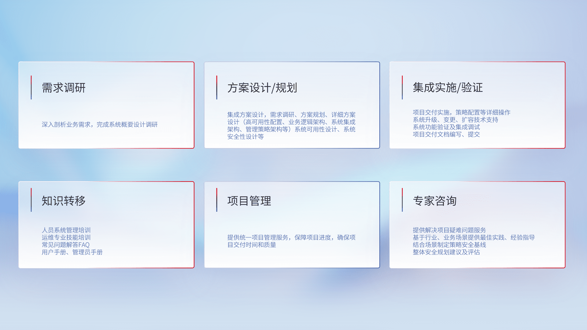 针对客户行业特性,,,,将宏观的安全战略和需求,,,通过专业的交付服务,,,,实现项目落地,,为客户提供标准规范的集成交付服务。。
